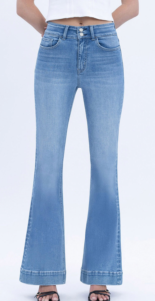 The high-rise waist features a double-button closure and zip fly for a secure, slimming fit that pairs perfectly with both cropped tops and tucked-in blouses. Classic five-pocket styling gives them a timeless denim look, while the full-length flare leg balances proportions and adds a touch of retro inspiration. A light blue wash with subtle fading makes these jeans versatile for every season.