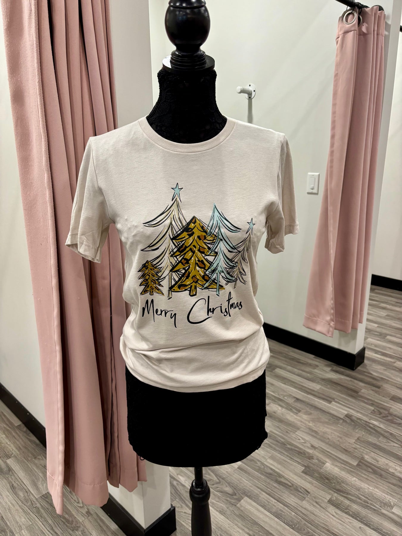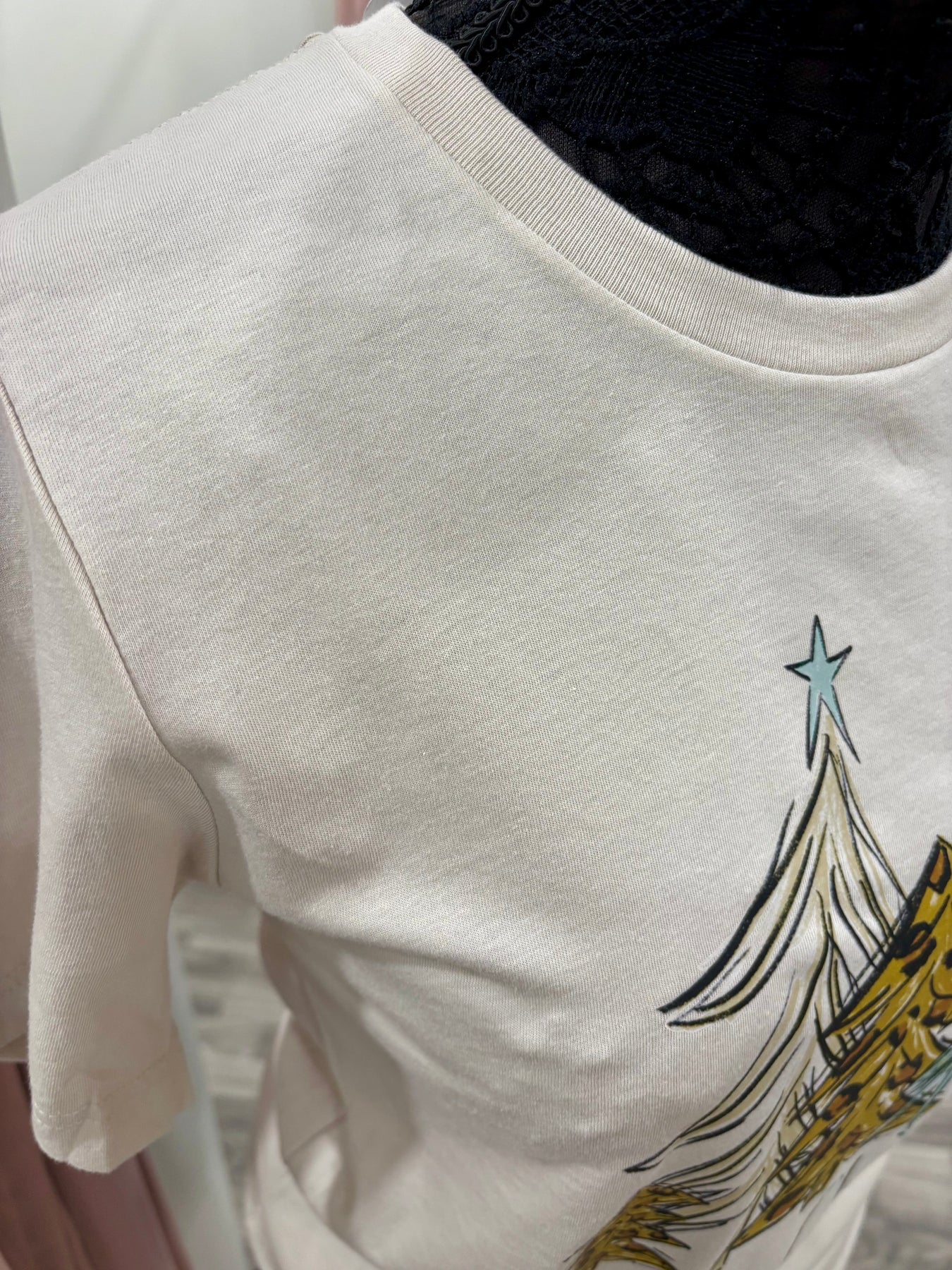 Featuring hand-drawn Christmas trees in shades of gold, tan, and soft teal, with a pop of leopard print and star details, this tee perfectly blends festive and trendy. The neutral tone makes it easy to pair with denim, cardigans, or shackets for any holiday occasion.