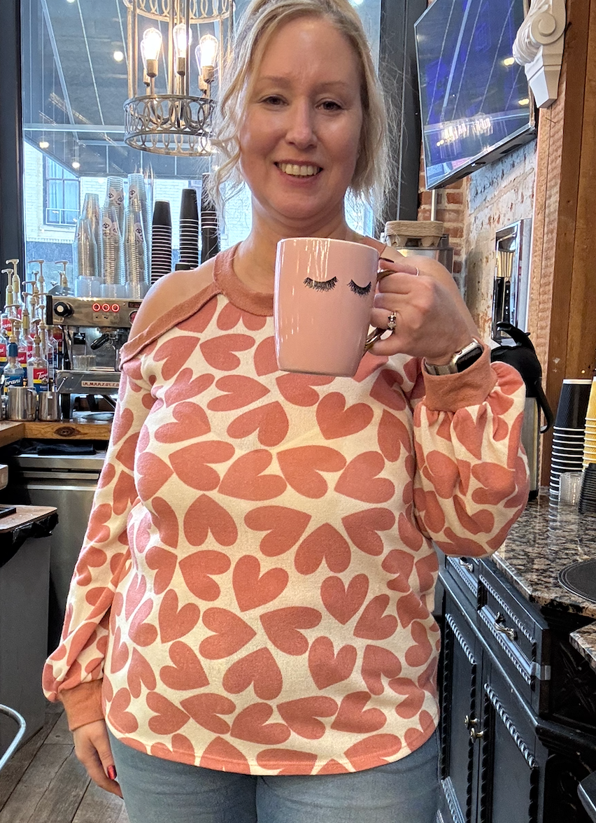 Add a playful pop of personality to your wardrobe with this cold shoulder heart print top. Featuring an allover heart pattern and contrasting solid bands, this long sleeve top blends fun design with an effortlessly flattering silhouette. The cold shoulder cutouts add a trendy touch while keeping it comfortable and easy to wear. Perfect for holidays, date nights, or casual outings when you want to stand out in style.