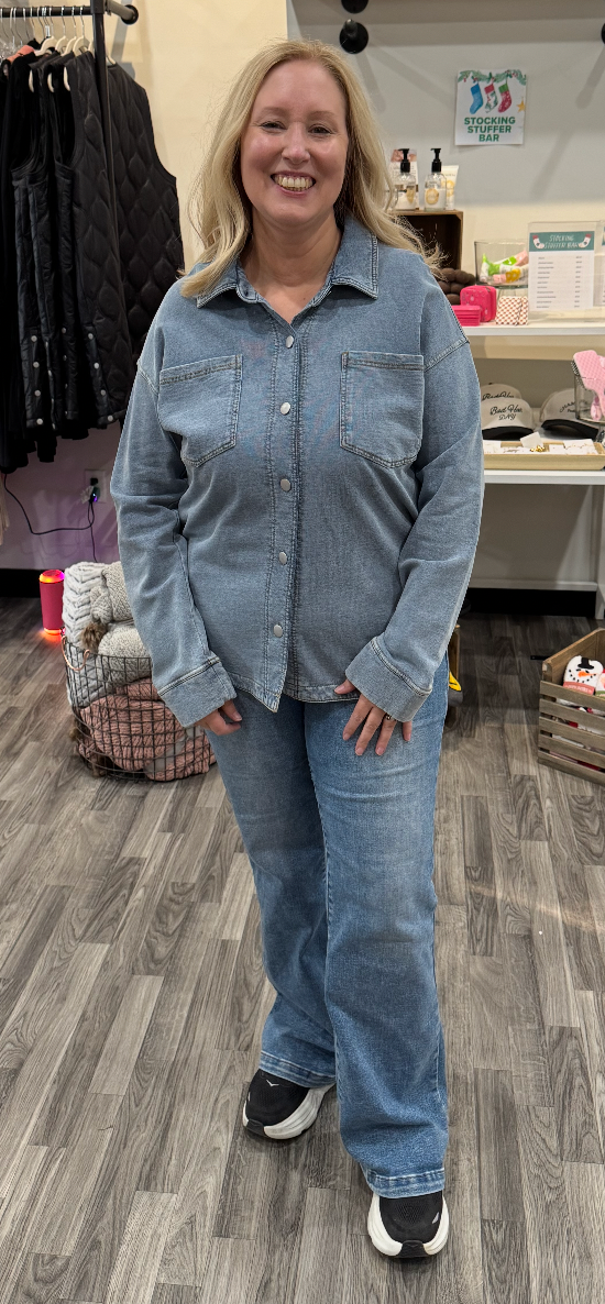 A closet staple with a modern twist, this Soft Knit Oversized Denim Shacket combines the casual look of denim with the comfort of a knit. Designed with a relaxed, oversized fit, it’s perfect for layering through every season. Featuring a button-down front, collared neckline, and chest pocket detail, this versatile piece doubles as both a lightweight jacket and an everyday shirt. The soft, flexible knit denim fabric gives it that broken-in feel you’ll love reaching for on repeat.