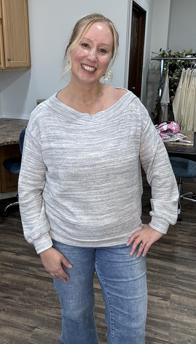 This heather gray knit sweater is the perfect blend of cozy and chic. Designed with a wide neckline that can be styled on or off the shoulder, it gives you versatile wearability for both relaxed and elevated looks. The soft ribbed knit fabricdrapes beautifully while offering just the right amount of stretch for all-day comfort.