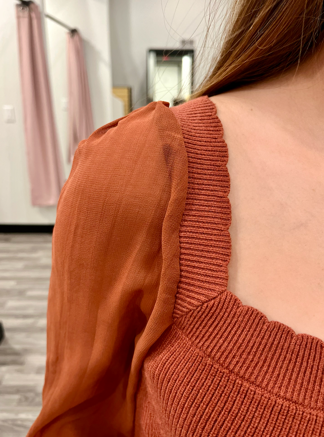 This Scallop Neck Edge Chiffon Sleeve Sweater Top is the perfect blend of soft knit comfort and feminine elegance. The fitted knit bodice features delicate scalloped edges along the square neckline, while sheer chiffon puff sleeves add a light, airy touch. Finished with ribbed cuffs for subtle volume, this sweater top transitions seamlessly from casual outings to dressier occasions.